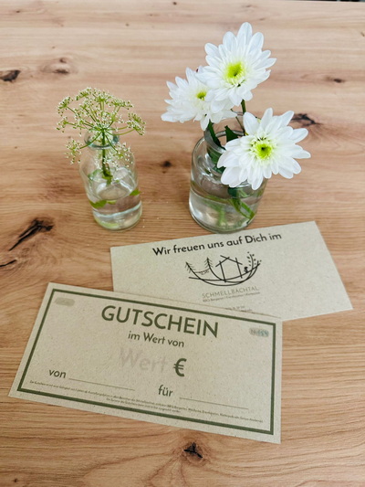 VOR ORT: Zu unseren regulären Öffnungszeiten bekommst du, auf Graspapier gedruckte, Gutscheine vor Ort im Schmellbachtal. Einfach an der Kasse nachfragen. Wir akzeptieren Bargeld, als auch Kartenzahlung.